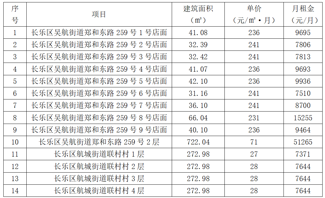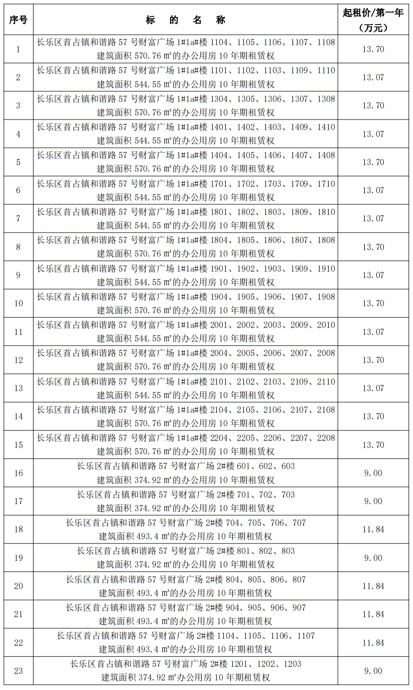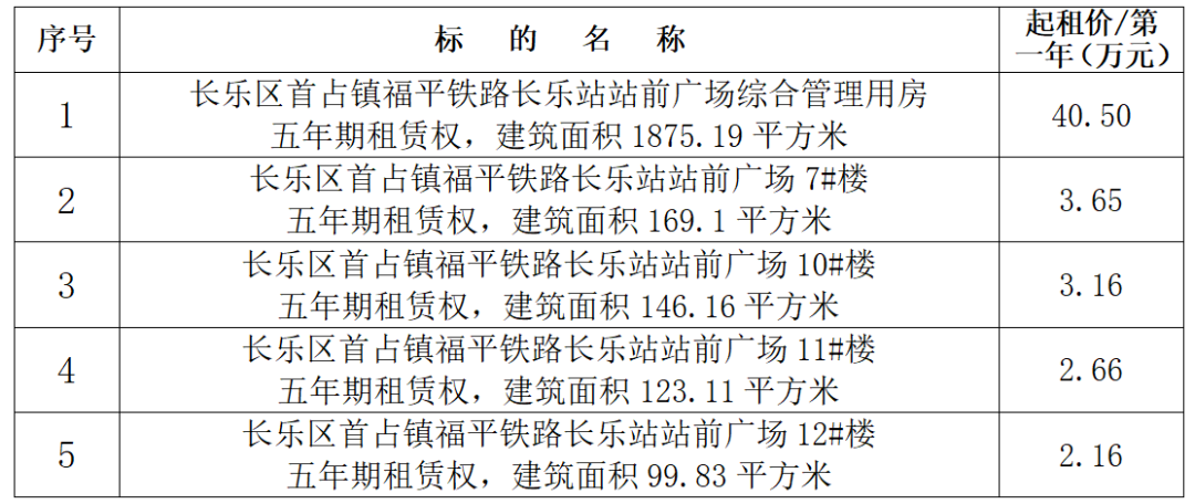 城投集团权属城投控股公司定于2023年3月13日(星期一)上午10:00时在福州市长乐区公共资源交易服务中心开标室一(福州市长乐区首占镇和谐路57号财富广场1#1a#楼行政服务中心七层)公开拍卖以下房产五年期租赁权(其中标的11-14先整体再单层竞拍):
